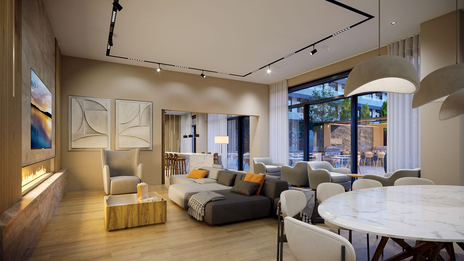 Reinforce the social ties that bind in this sophisticated space designed with comfortable seating, subtle lighting, and a glowing fireplace. Here, amid a calming neutral colour palette, natural wood features and throw blankets, any celebration is bound to be a success.